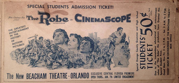 Ticket du film La Tunique, premier film de l’histoire du cinéma exploité en Cinémascope.