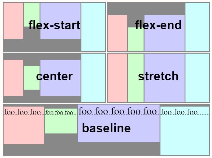flex-start : le premier bord (début) des items est placé au début de la ligne transversaleflex-end : le dernier bord (fin) des items est placé à la fin de la ligne transversalecenter : les items sont regroupés au centre de l’axe transversalbaseline : les items sont répartis de manière à ce que leur ligne de base s’alignestretch (par défaut) : les items s’étirent de façon à remplir le conteneur (tout en respectant min-width/max-width)Le schéma suivant permet de mieux comprendre la façon dont les flex-items sont disposés selon la valeur donnée à align-items :