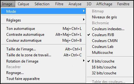 Le choix du mode de couleurs peut s’effectuer à deux moments différents de votre création. Comme il a été dit dans l’intro de ce tuto, vous pouvez (devez) en choisir un au moment de la création de votre nouveau document. Mais pas de panique, ne vous affolez pas, vous allez pouvoir le modifier autant de fois que vous le souhaitez par le biais du menu Image>Mode. Cela pourra d’ailleurs vous être bien utile dans certains projets qui nécessitent de passer du RVB au niveau de gris ou autre.